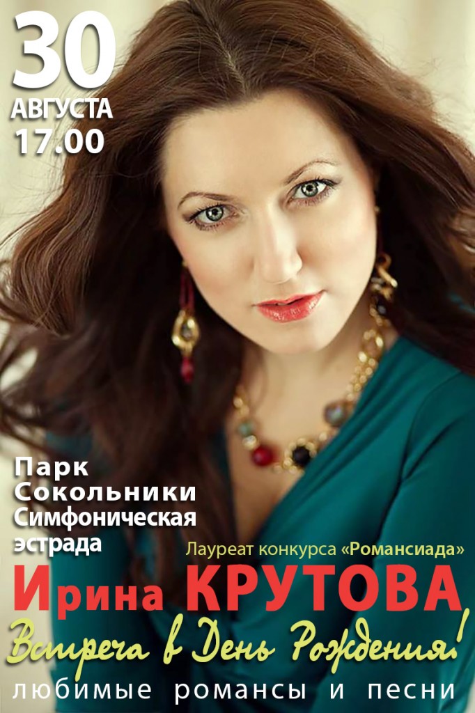 Парк Сокольники (Симфоническая эстрада), начало в 17.00 Музыкальный салон Галины Преображенской - сольный концерт Ирины Крутовой «Встреча в День Рождения!»