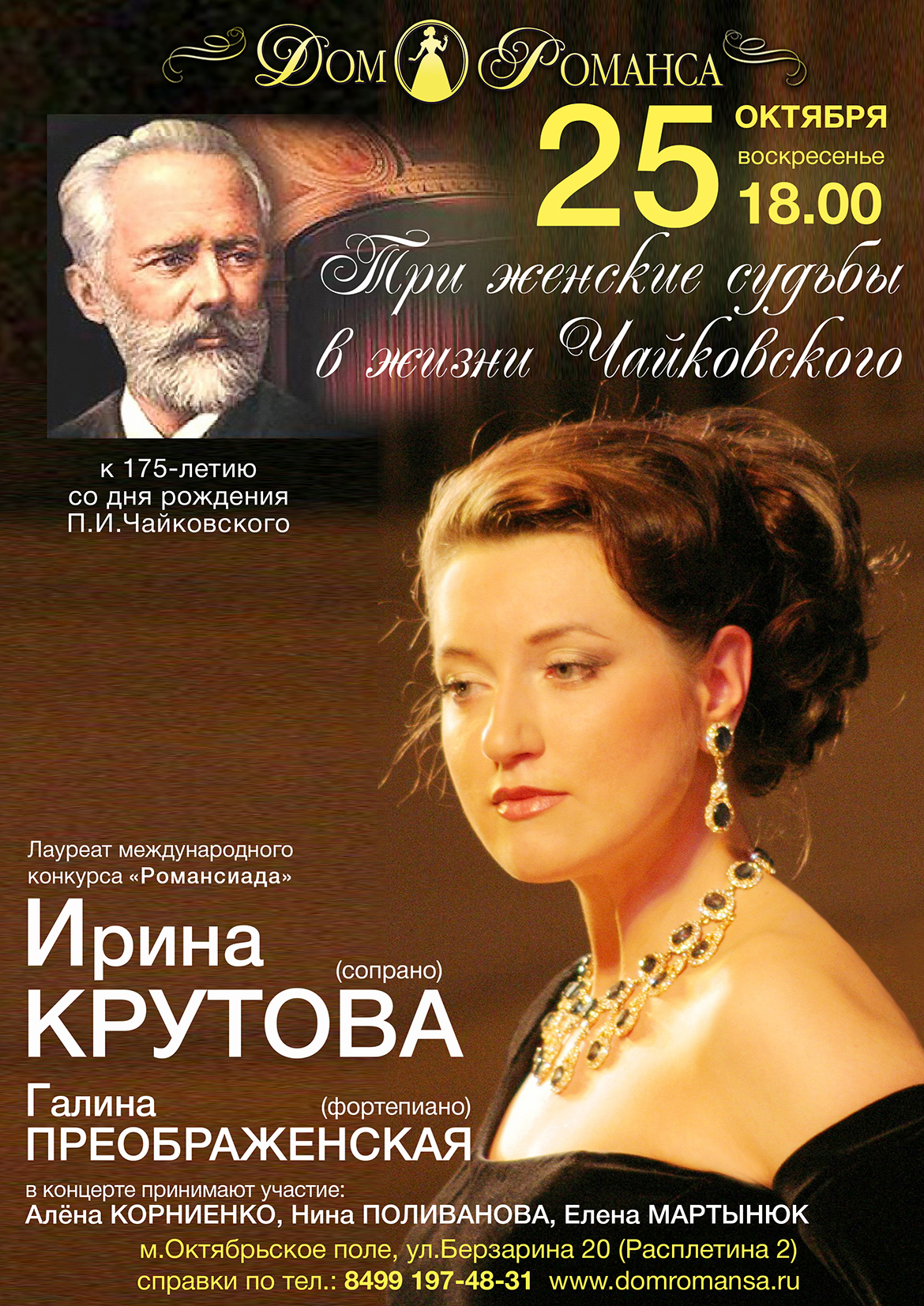25 – Москва. Дом романса. Ирина Крутова и Галина Преображенская с программой «Три женские судьбы в жизни Чайковского» – концерт к 175-летию со дня рождения П.И.Чайковского.